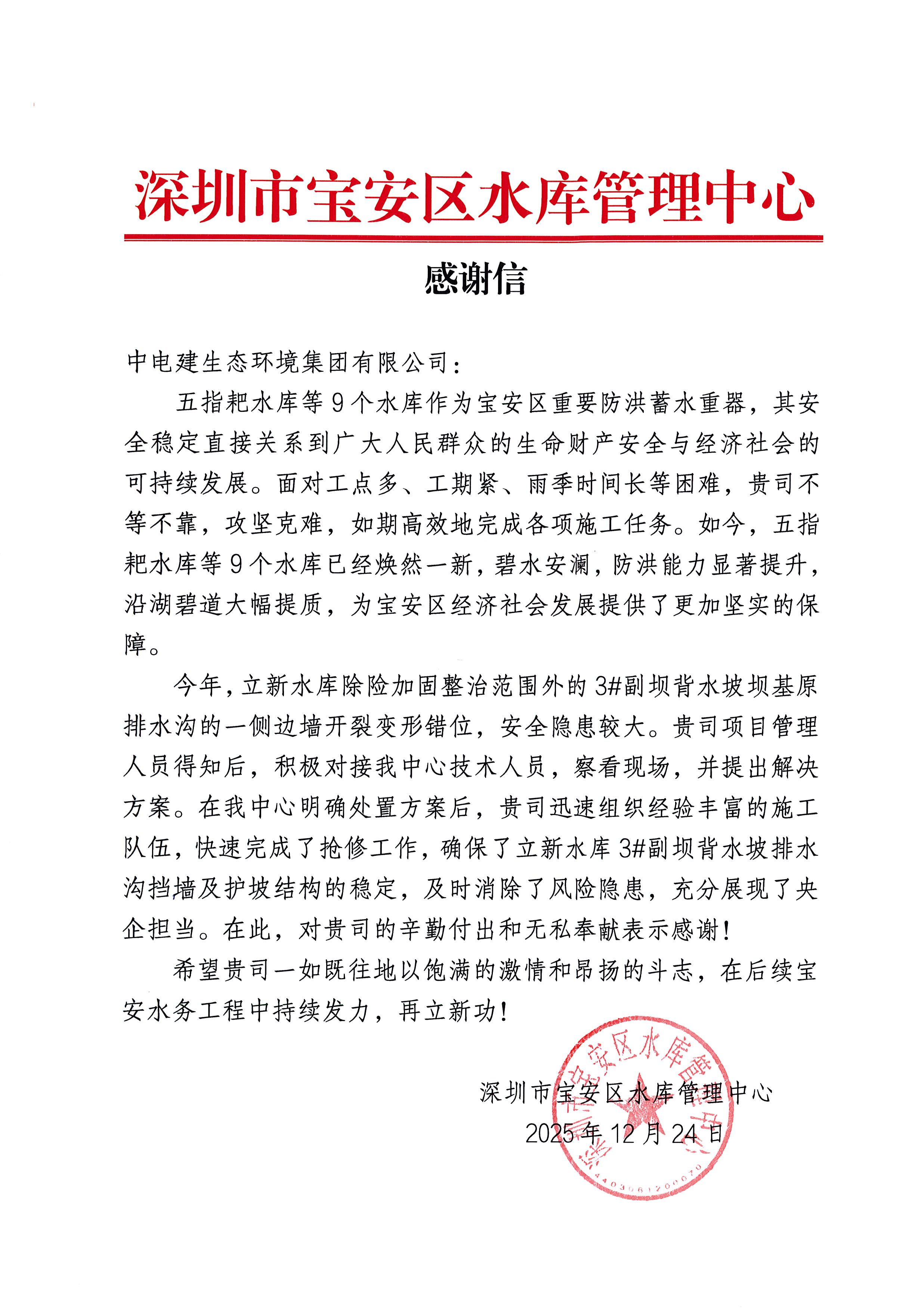 12月24日,深圳市宝安区水库管理中心向公司发来感谢信,对公司在宝安区9座水库除险加固工程中的辛勤付出、高效履约与主动担当表示高度认可与感谢。