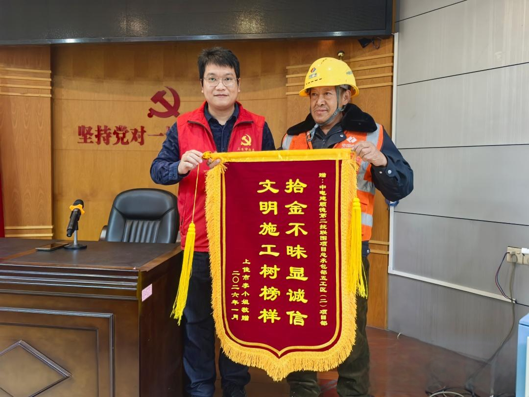 1月19日,顺德市民李女士通过上佳市社区将一面印有“拾金不昧显诚信,文明施工树榜样”的锦旗送至中电建顺德第二批联围项目总承包部五工区项目部施工人员刘福全手中,对其个人拾金不昧的行为表达感谢,对项目部践行央企社会责任服务民生表示赞誉。