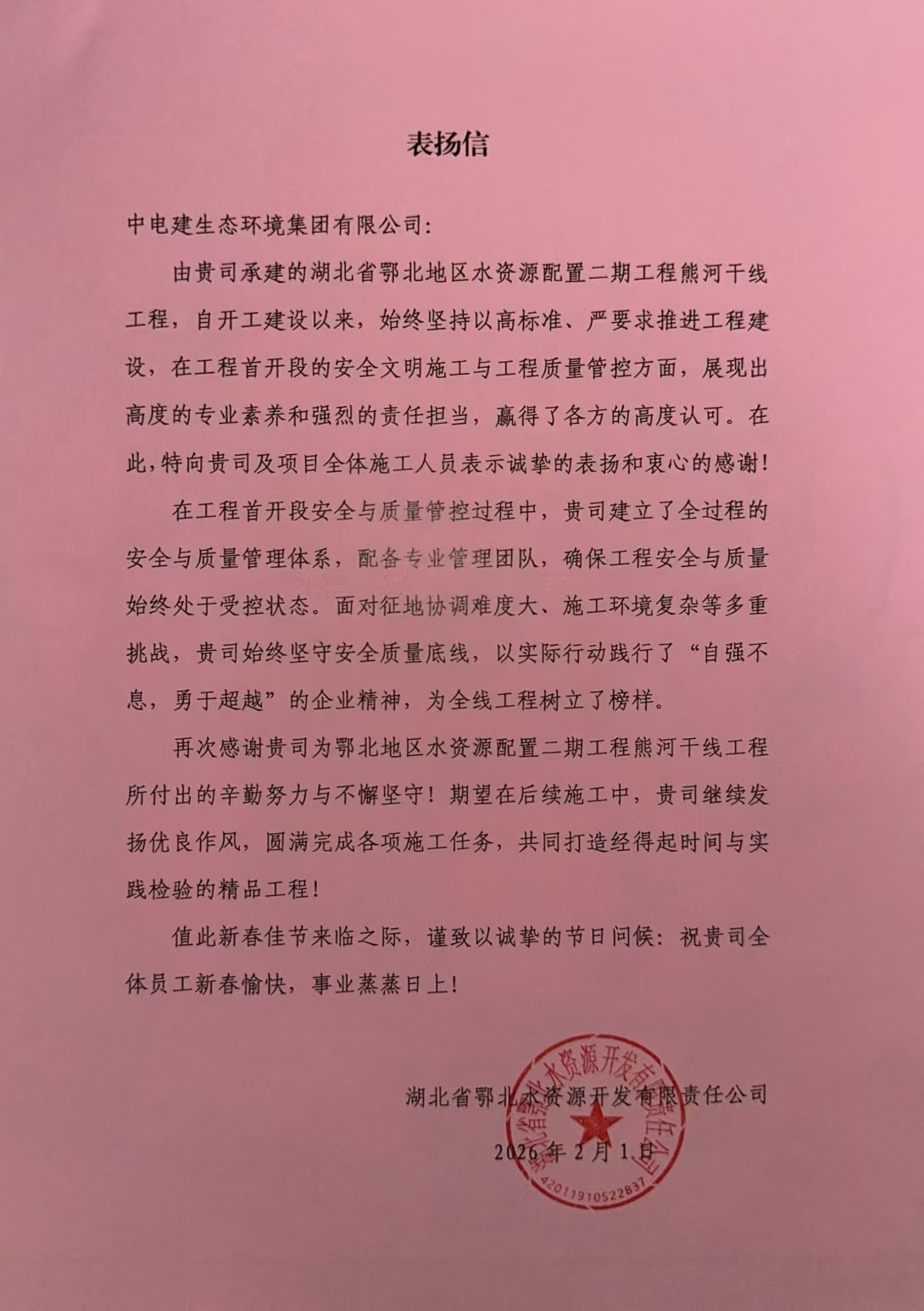 近日,湖北省鄂北水资源开发有限责任公司发来表扬信,对公司承建的熊河干线工程优质履约和项目团队的责任担当给予高度评价,对全体建设者的付出表示了感谢。